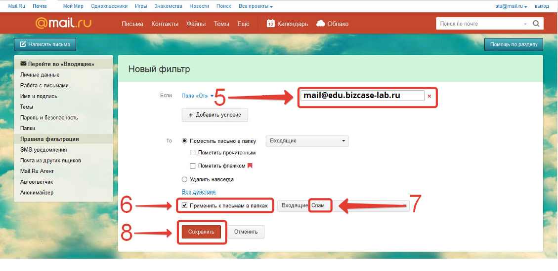 6. Поставьте галочку вполе «Применить к письмам в папках».